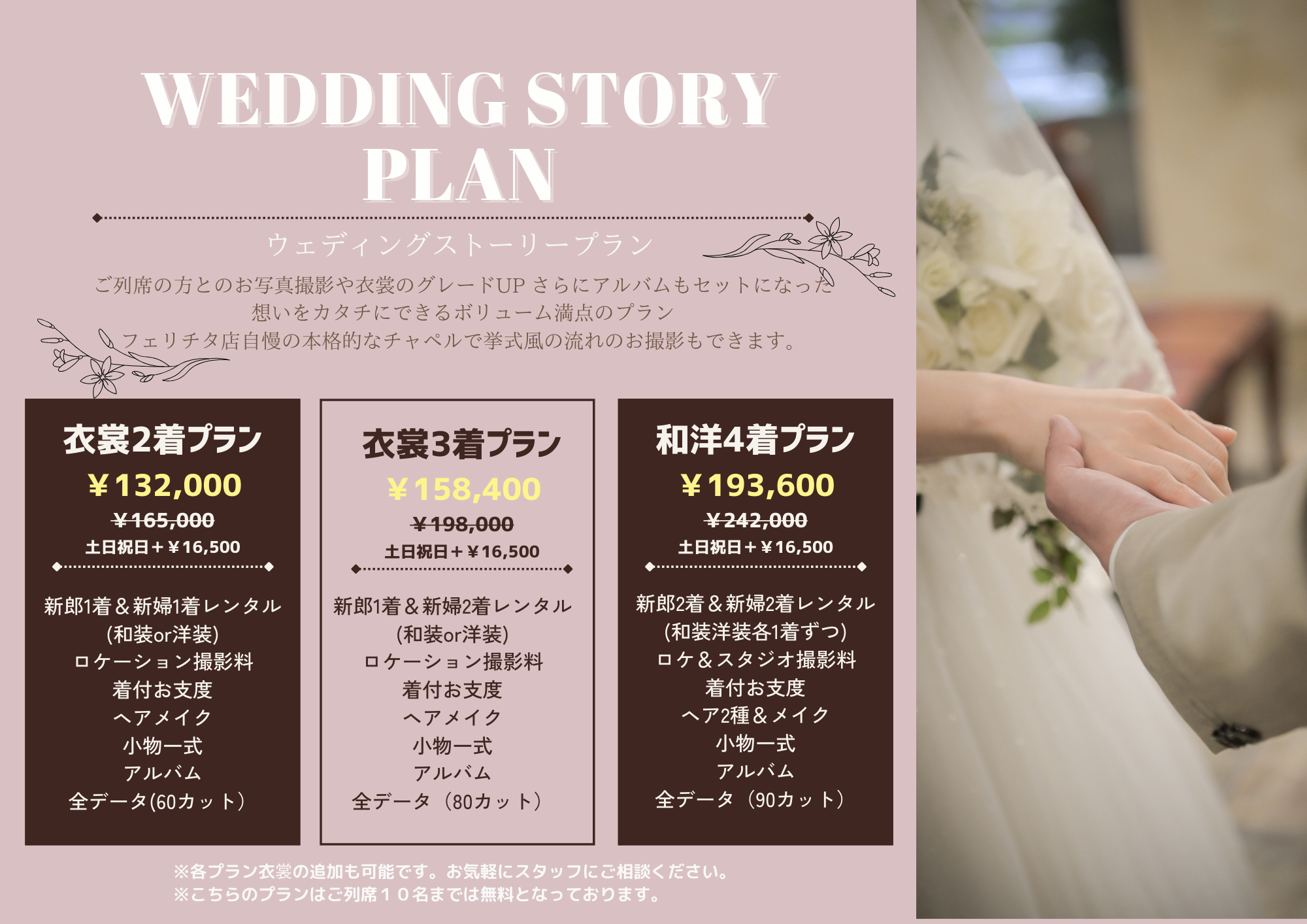 ウェディングストーリープランは衣裳・ヘアメイク・全データ・アルバムなど撮影に必要なものすべてがコミコミなお得で分かりやすいプランです✨